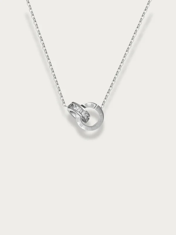 The Classic Roman Numerals Diamond Band Necklace features interlocking rings — one engraved with bold Roman numerals, the other accented with shimmering stones. This symbolic design represents eternity, strength, and connection, making it a meaningful piece for daily wear or thoughtful gifting.