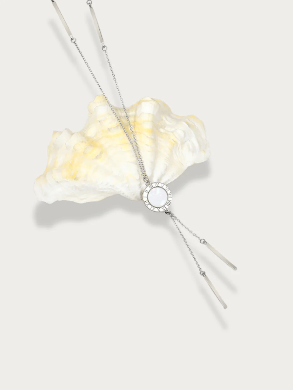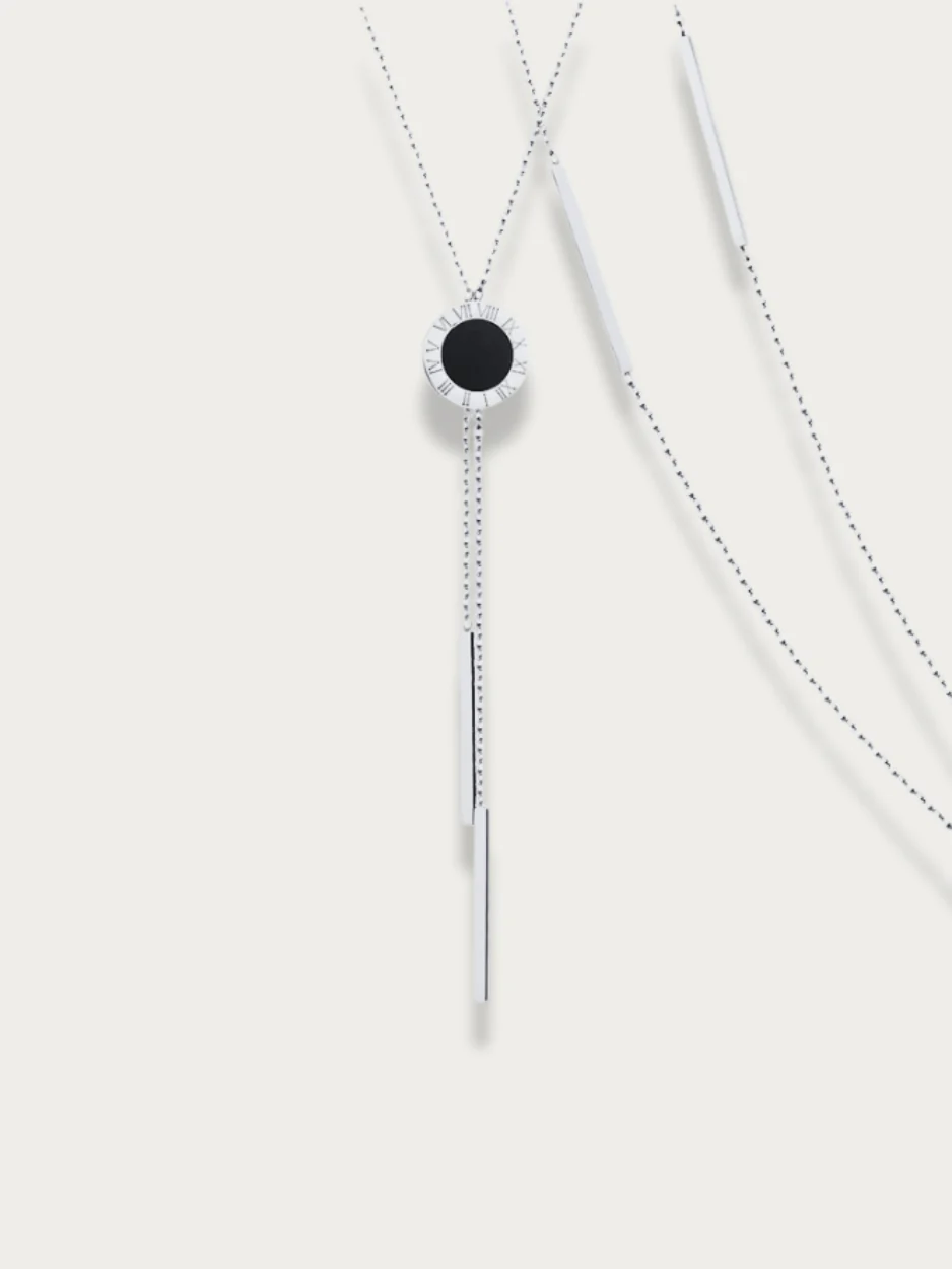 The centerpiece of this design is its dual-sided pendant, framed by classic Roman numerals. It offers two distinct aesthetics in one: a sleek black enamel face for bold contrast, and a luminous mother of pearl inlay for a softer, natural radiance. Simply flip the pendant to match your mood or occasion. It is a piece that symbolizes continuity and style,perfect for layering or wearing as a standalone symbol of understated sophistication.